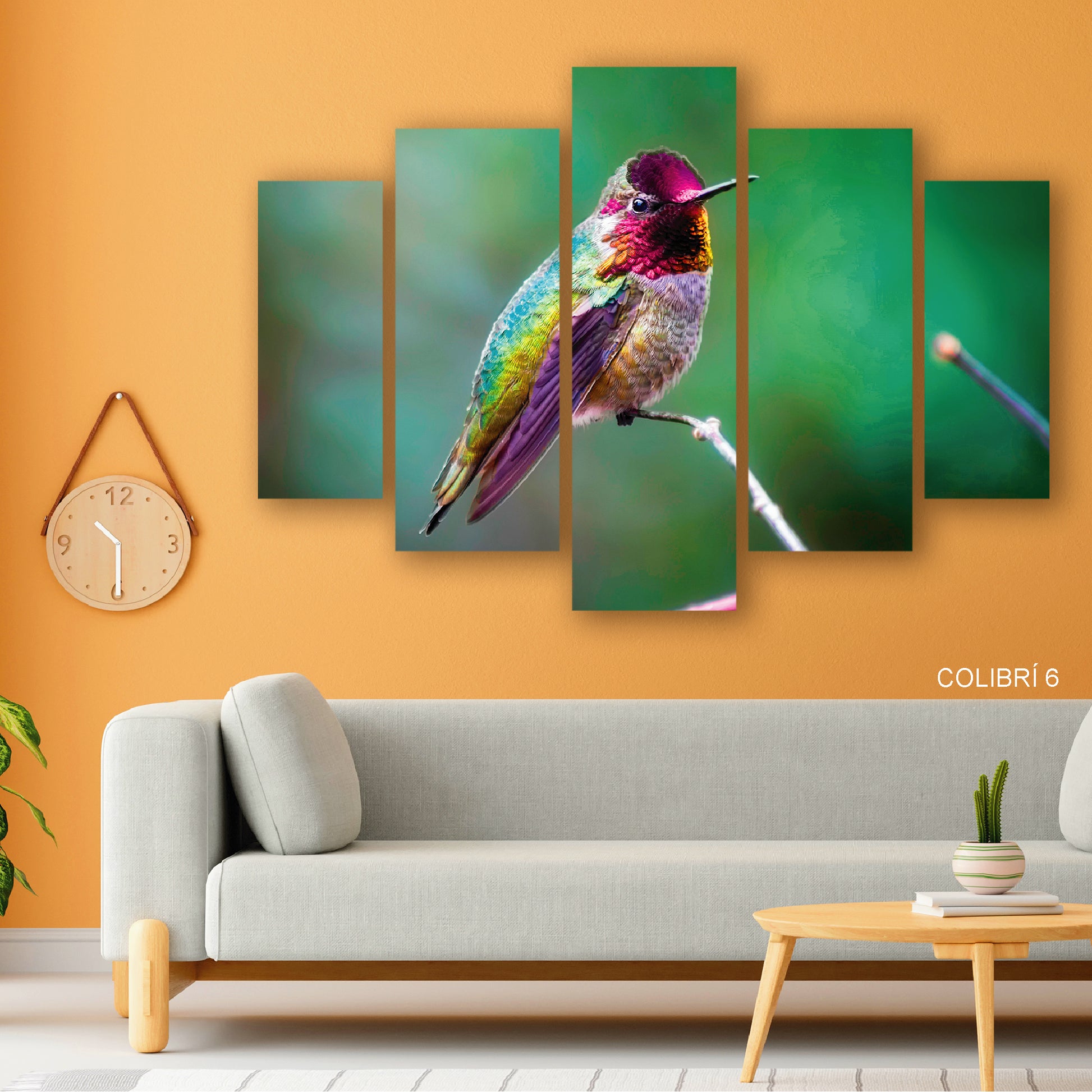 Subcoleccion Cuadros De Colibri/ Nombre: Cuadro Joya Alada: Colibrí Multicolor en Rama Natural