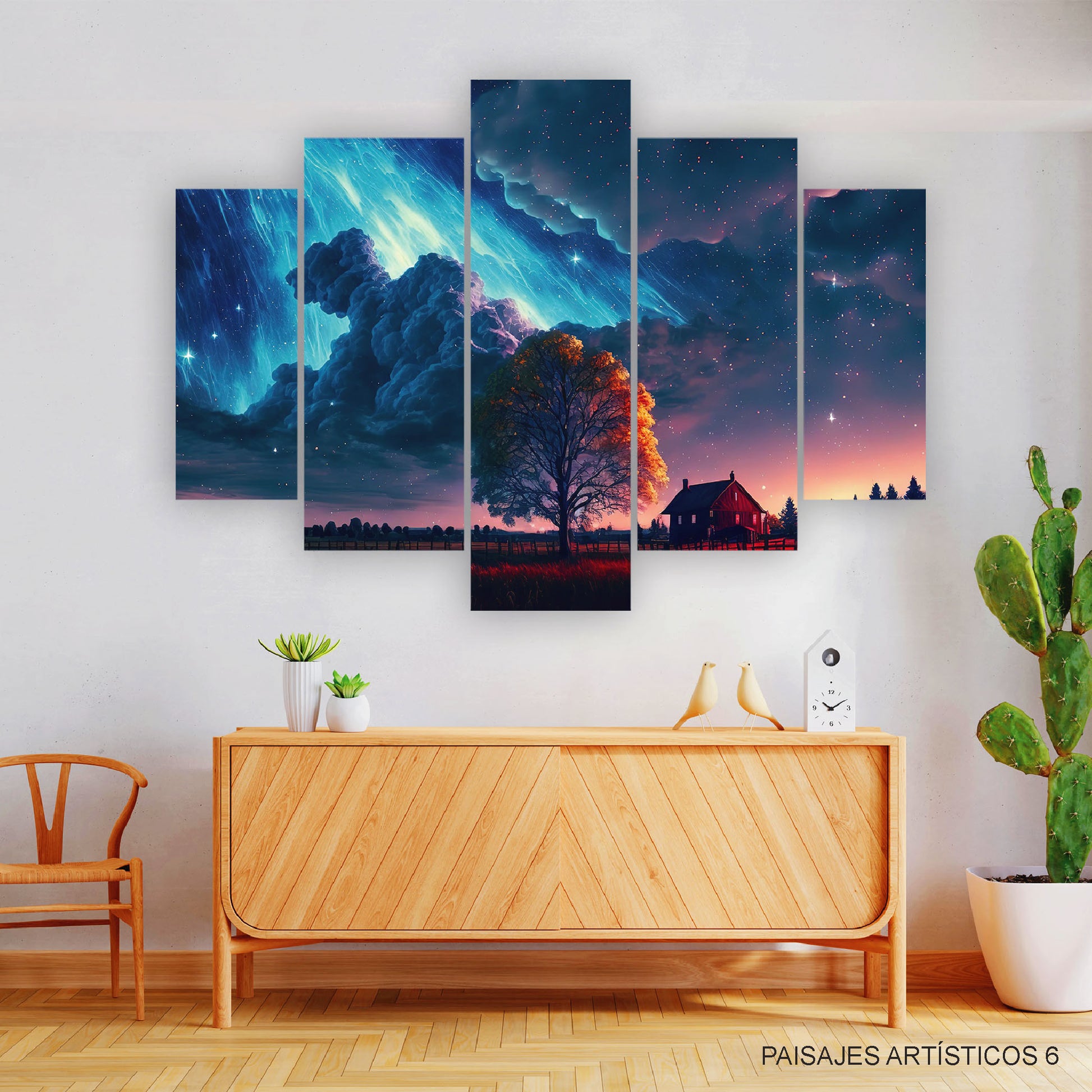 Subcoleccion Cuadros Paisajes Artísticos/ Nombre: Cuadro Noche Estelar Fantástica: Auroras y Estrellas Fugaces en Paisaje Onírico