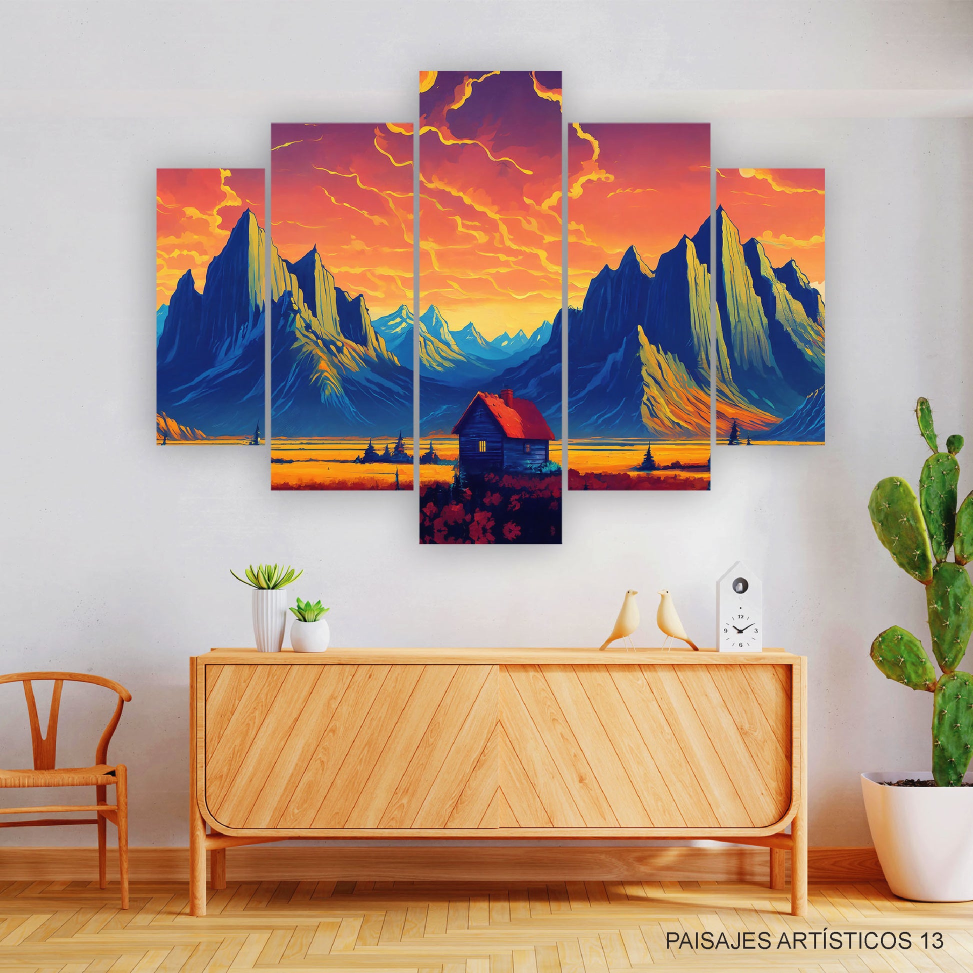 Subcoleccion Cuadros Paisajes Artísticos/ Nombre: Cuadro Refugio Crepuscular: Cabaña Montañosa al Atardecer