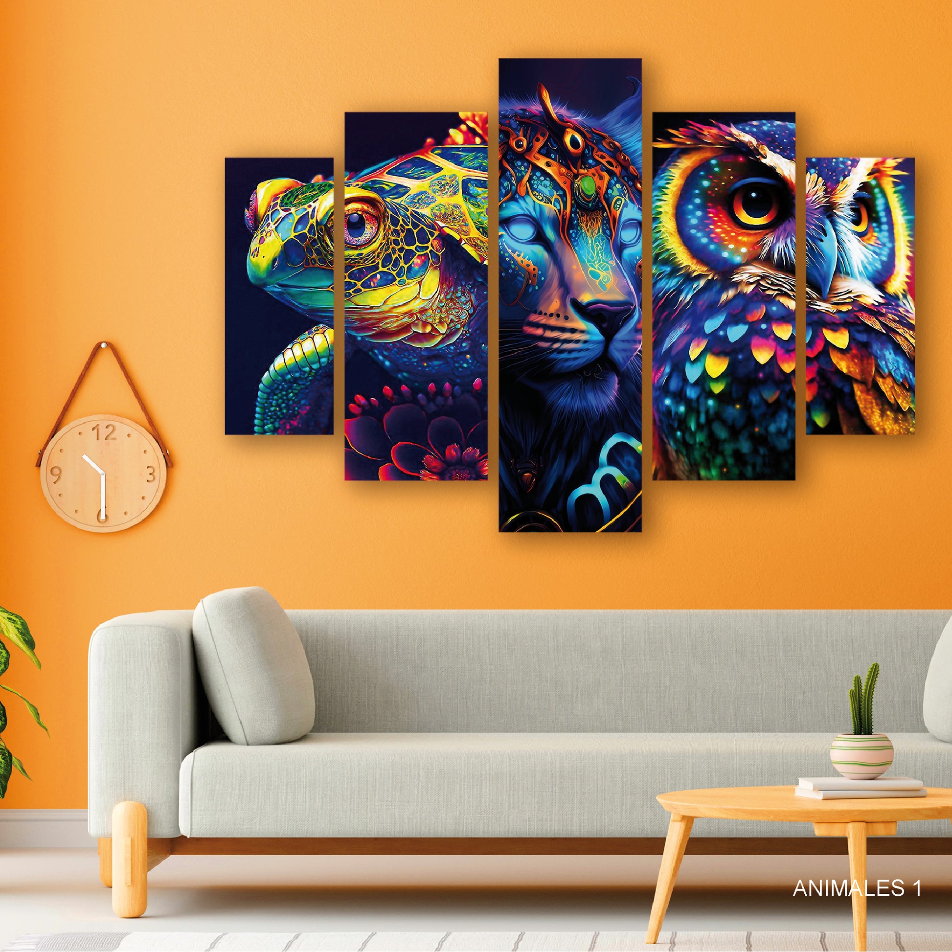 Cada pincelada revela la esencia vibrante de la vida, donde jaguares, colibríes, elefantes, mariposas y leones se funden en una danza psicodélica de formas y texturas. Los colores, intensos y luminosos, evocan la energía primordial que conecta a todos los seres vivos.